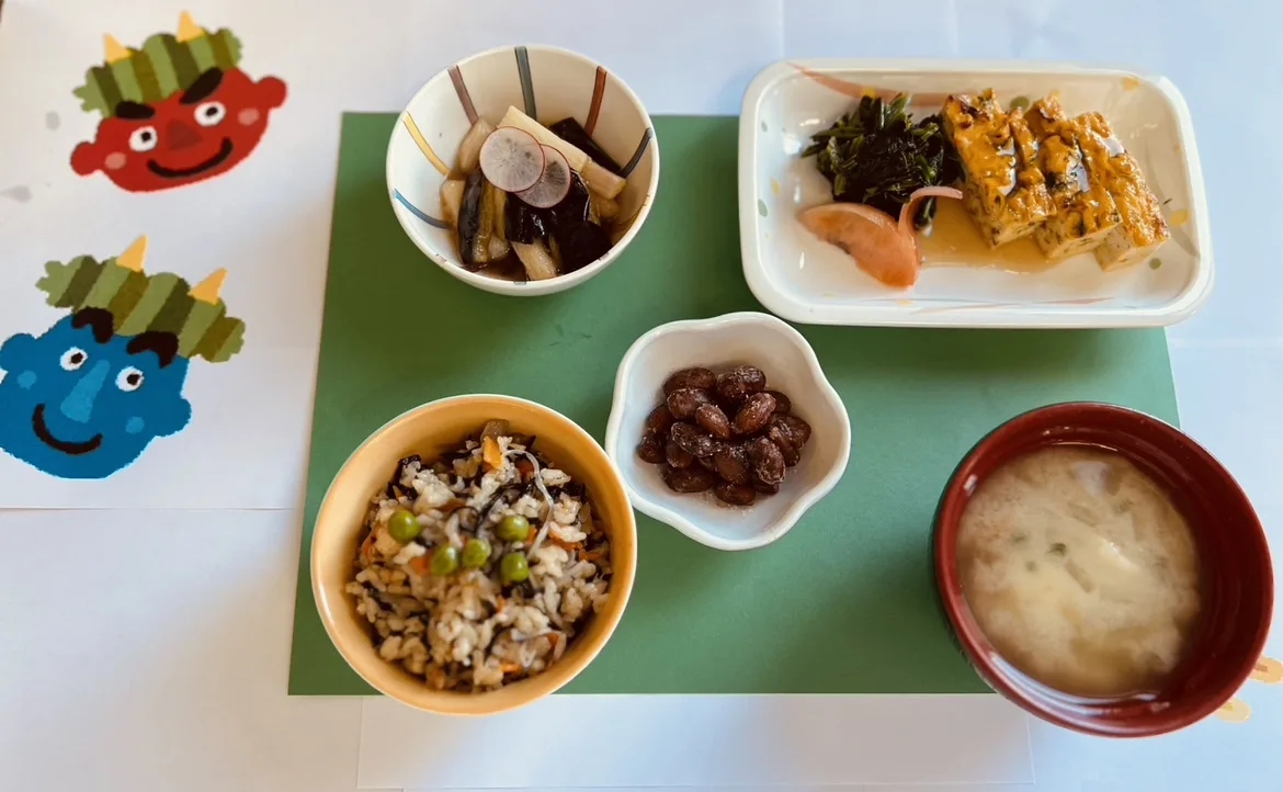 昨日の昼食では厨房から素敵な節分料理が提供されました(^^)/豆やいわしなど節分にゆかりのある食材を取り入れたメニューで、食べ易さにもご配慮されたメニューです✨