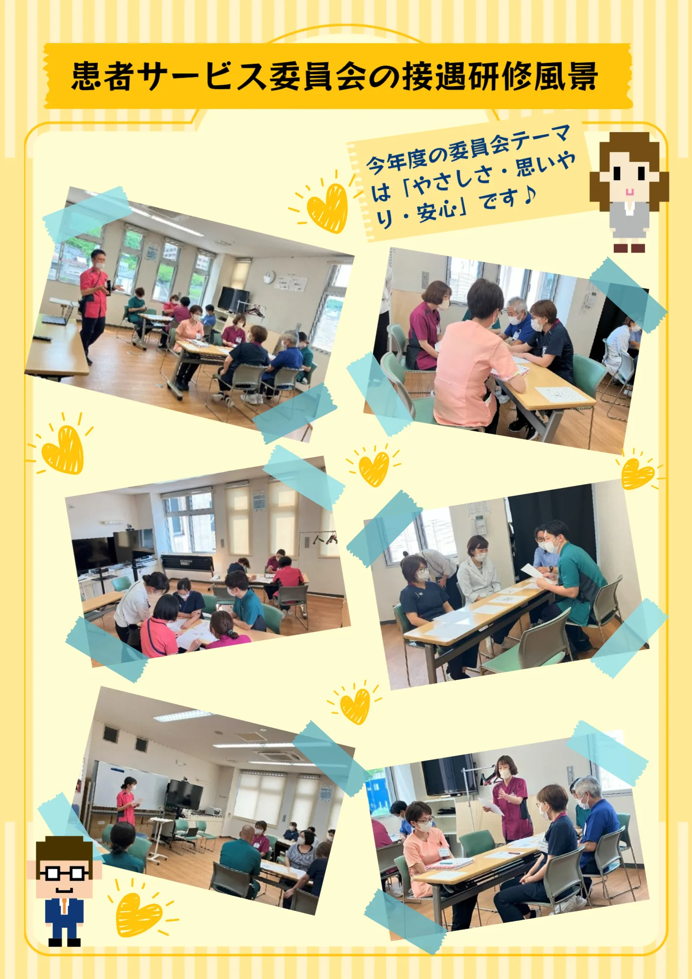 10月のこばなし担当は地域医療連携室の山野です(*^-^*)今回は患者サービス委員会の研修内容をご報告させていただきます♪今回は「職員がコミュニケーションを図りやすい環境を作ることで、患者サービスにつながる」という目的で参加型の研修会を企画しました!!委員のメンバーが患者様役と職員役を演じて、実際に起こり得そうな場面を見てもらい、少人数でグループを作り、各ブループで患者様への接し方について話し合いを行ってもらいました。グループは多職種で構成し、参加者それぞれが発言しながらの盛り上がる研修でした♪今年度の委員会のテーマが「やさしさ・思いやり・安心」をテーマにそれぞれの部署が目標に掲げています。これからも患者様、ご家族様、当院に関わる方々にやさしさ・思いやり・安心