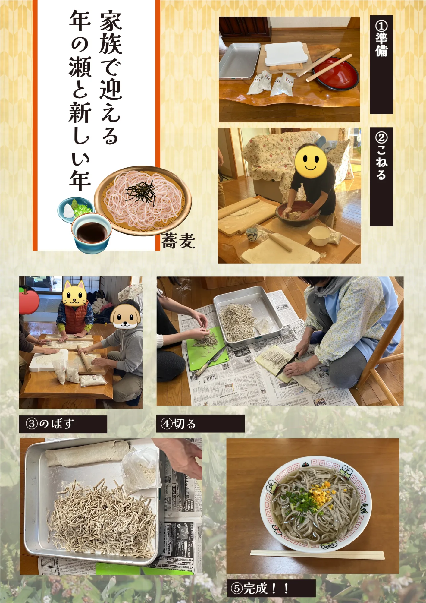 粉を量り、こね、のばし、包丁を入れるたびに、リズムよく刻まれる音が年末を告げます。新聞紙の上で切りそろえられたそばは、やがて湯気の立つ鍋へ。手間を惜しまず仕上げた一杯には、一年を無事に過ごせた感謝と、新しい年への願いが込められています。最近では見かけなくなった、家族や仲間と迎えるお正月準備の風景です。