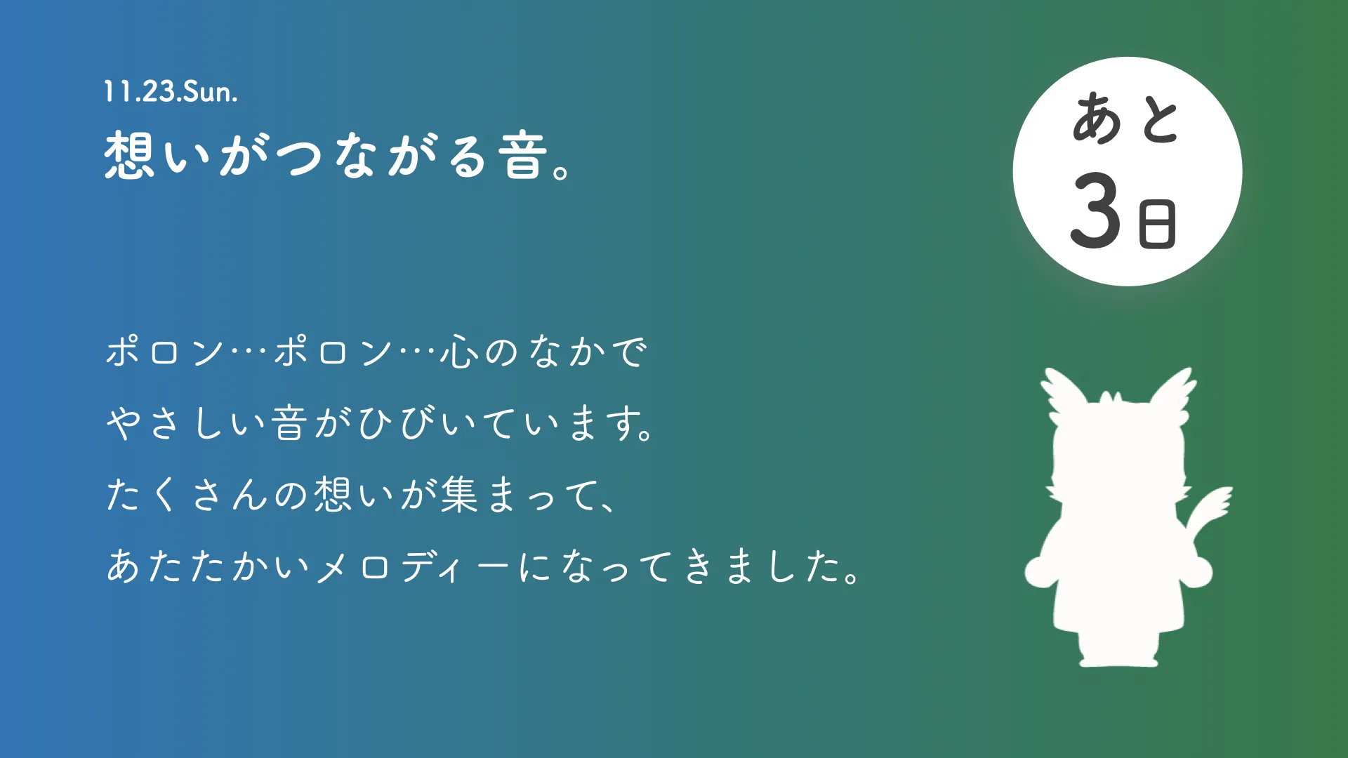 その他 2025.11.23 公式キャラクター発表まであと3日 想いがつながる音。 ポロン・・・ポロン・・・心の中でやさしい音がひびいています。たくさんの想いが集まって、あたたかいメロディーになってきました。 記事のタイトルとURLをコピーする Post Share Line note