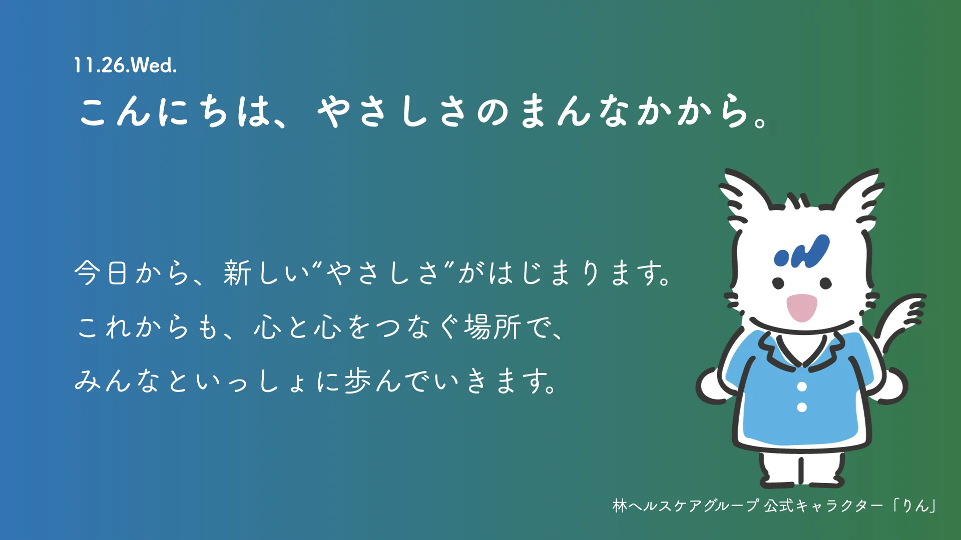 その他 2025.11.26 公式キャラクター発表! こんにちは、やさしさのまんなかから。 今日から、新しい”やさしさ”がはじまります。これからも、心と心をつなぐ場所で、みんなといっしょに歩んでいきます。 公式キャラクター「りん」誕生のお知らせ 記事のタイトルとURLをコピーする Post Share Line note