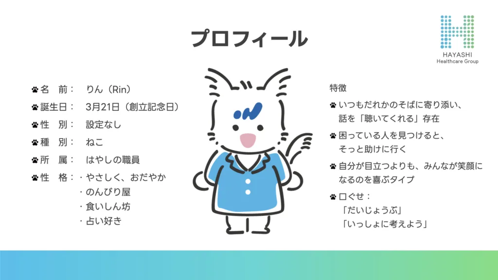 当初、病院のキャラクターとして公募しましたが、林ヘルスケアグループ全体のキャラクターとして今後活躍していきます。